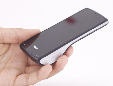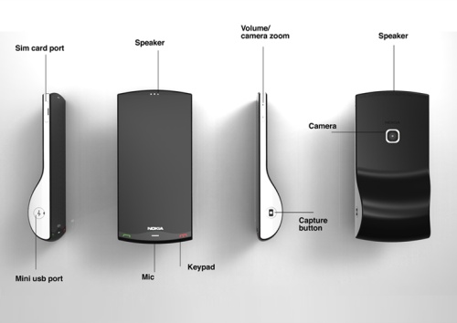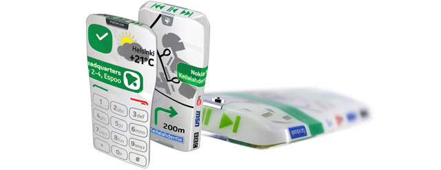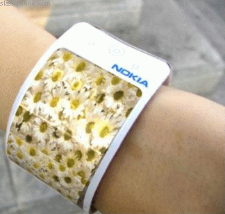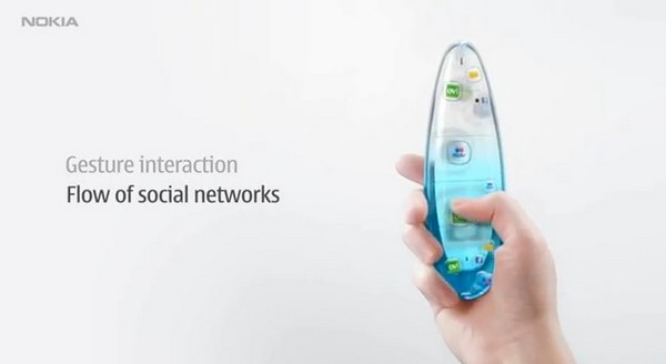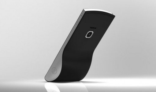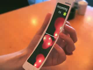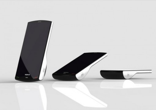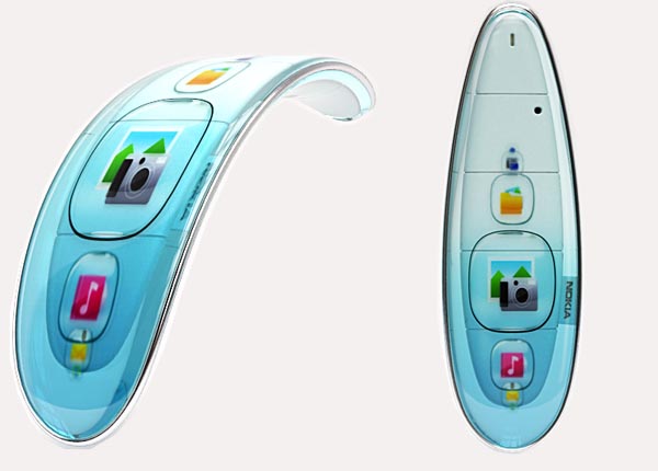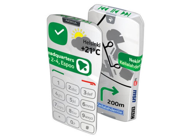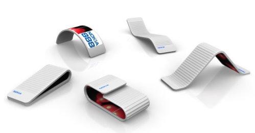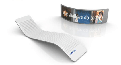 Prototype de téléphone Nokia d’une forme ovale à écran souple et par flexion : surfer sur internet juste en pliant son téléphone.