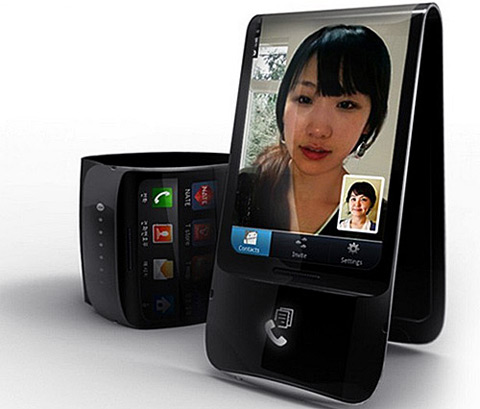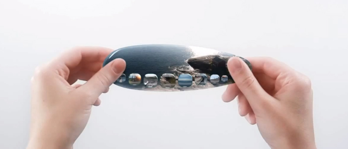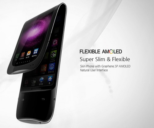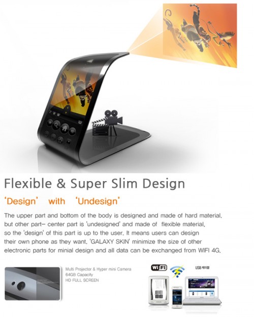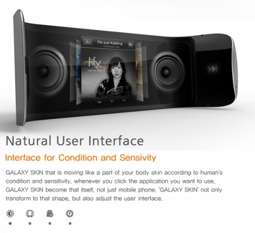 Le Galaxy Skin est un concept de téléphone Samsung doté d’un écran « Super Amoled » souple et tactile de 4 pouces soit 800 par 400.